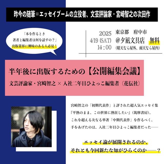 4/19(土)14時〜 宮崎智之・入社二年目編集者(花伝社)「半年後に出版するための【公開編集会議】」東京・分倍河原 夕凪文具店