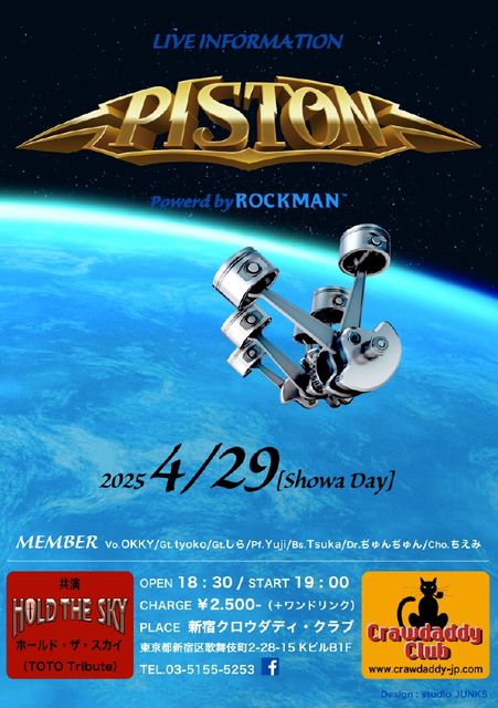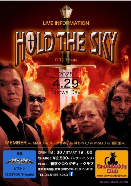 4/29 本日のライブ Hold the Sky(as TOTO) & Piston(as Boston) Live OPEN 18:30 START 19:00 CHARGE 2500円 よろしくお願いいたします!!