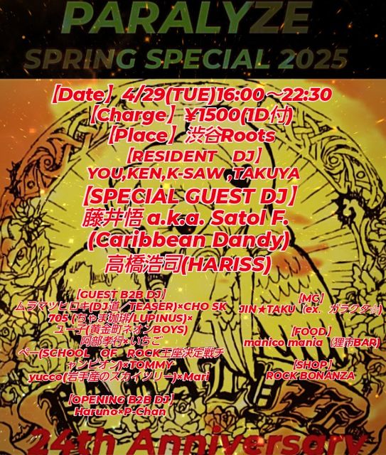 □■□PARALYZE SPRING SPECIAL 2025□■□ 【日時】4/29(火祝)16:00〜22:30 【開催場所】渋谷Roots http://www.roots1998.com/ 【料金】¥1500(1D付) 【RESIDENT DJ】 YOU,KEN,K-SAW ,TAKUYA 【SPECIAL GUEST DJ】 藤井悟 a.k.a. Satol F. (Caribbean Dandy) 高橋浩司(HARISS) 【GUEST B2B DJ】 ムラマツヒロキ(DJ道/TEASER)×CHO SK 705 (ちゃま珈琲/LUPINUS)× ユー子(黄金町ネオンBOYS) 阿部孝行×いちご ぺー(SCHOOL OF ROCK王座決定戦チャンピオン)×TOMMY yucco(岩手産のスカイツリー)×Mari 【OPENING B2B