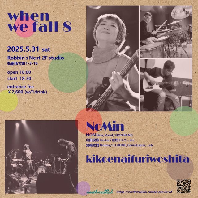 open/start 18:00/18:30 entrance fee \2,000 + 1D \600 ●LIVE NoMin(NON+ 山田民族+箕輪政博) kikoenaifuriwoshita ●WEB https://northmalllab.tumblr.com/wwf ●予約 northmalllab@yahoo.co.jp