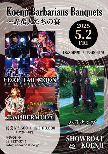 5·î2Æü(¶â) ÅìµþÅÔ ¹â±ß»û ¥·¥ç¡¼¥Ü¡¼¥È https://www.showboat1993.com/ Ž¢Koenji Barbarians Banquets ¡ÁÌîÈڿͤ¿¤Á¤Î±ã¡× ½Ð±é:Taxi BERMUDA (Vo&G:ÃæÂ¼ÈôÅÍ¡¢Ba&cho:Danny!¡¢Dr&cho:¥è¥·¥ß) / COAL TAR MOON / ¥Ð¥é¥Ê¥ó¥Ö open18:30 start19:00¡¡Á°Çä¤ê2500±ß ÅöÆü3000±ß ¶¦¤Ë+1DRINK ¢¨ Taxi BERMUDA¤Ï19:00¡Á¤Î½Ð±é¡£