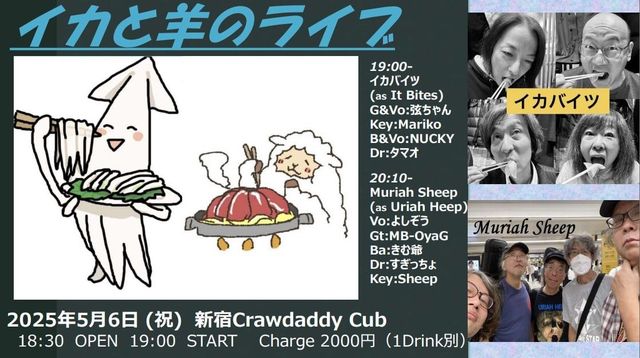 5/6 本日のライブ イカと羊のライブ OPEN 18:30 START 19:00 CHARGE 2000円 act 19:00〜 イカバイツ (as It Bites) 20:10〜 Muriah Sheep(as Uriah Heep) よろしくお願いいたします!!