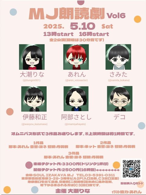 MJ朗読劇vol.6 ●挨拶● はじめまして、主催の大潮りな(夢彗)と申します(^-^) 私は普段声優として、声優講師、ラジオ、舞台、司会、イベント、YouTube等で活動しています 声優として活動出来る様になるまでたくさんの方に支えて頂き、たくさんの経験が出来て今の私があります。 役者にとって【お芝居を披露出来る場】というのは貴重な為『お芝居をやりたい方、やる気のある方にお芝居を披露出来る場を設けたい』と思い企画させて頂き、私が普段開催している『声優ボイトレオフ