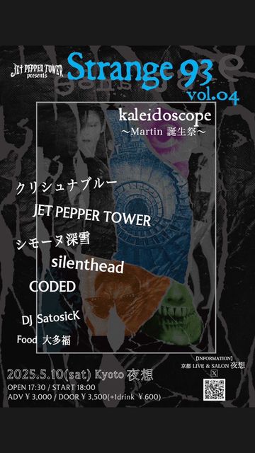 2025 05 10 (sat) Jet Pepper Tower presents Strange 93 vol.04 マーティン生誕祭 Open 5:30 Start 6:00 クリシュナブルー Jet Pepper Tower シモーヌ深雪 silenthead CODED DJ Satosick @ 京都 Live&Salon 夜想