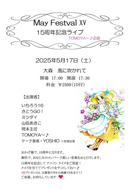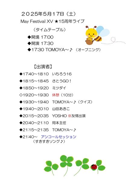 ¡ü³µÍ× £µ·î£±£·Æü¡ÊÆü¡Ë Â翹¡§É÷¤Ë¿á¤«¤ì¤Æ TOMOYA¡Á¢ö´ë²è May Festival XV 17:00/17:30 2500±ß(1DÉÕ) ¡ü½Ð±é ¤¤¤Á¤í¤¦16¡¢¤µ¤È¤¦£Ç£Ï¡ª¡¢¥ß¥Ä¥À¥¤¡¢»³ÅĤ¢¤¤³¡¢YOSHIO¡¢²¬ËܼçǤ¡¢TOMOYA¡Á¢ö