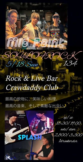 5/18 ËÜÆü¤Î¥é¥¤¥Ö¡¡ SOUL OF ROCK Vol 134¡¡ OPEN 18:30 START 19:00 CHARGE adv/door \2800/\3300¡¡ act¡¡ MId Point¡¡ SPLASH¡¡ ¤è¤í¤·¤¯¤ª´ê¤¤¤¤¤¿¤·¤Þ¤¹¡ª¡ª