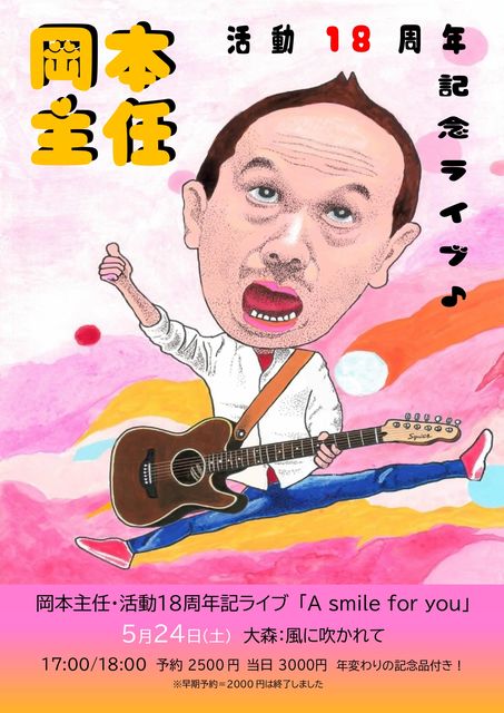 ●概要 5月24日(土) 大森:風に吹かれて http://oomorikazefuka.weebly.com/ 17:00/18:00 予約2500円 当日3000円(+オーダー) ※記念品付! ●内容 岡本主任の年間最大のライブ!=執念でやっている周年ライブ(笑)。 今年は18周年! 事前アンケートでの結果を発表しながらのステージ♪ 恒例の「1位を当てろ!」は勿論、これまた恒例の「ステージ衣装のプレゼント」などもございます! いずれにせよ、これは絶対に来て欲しい!