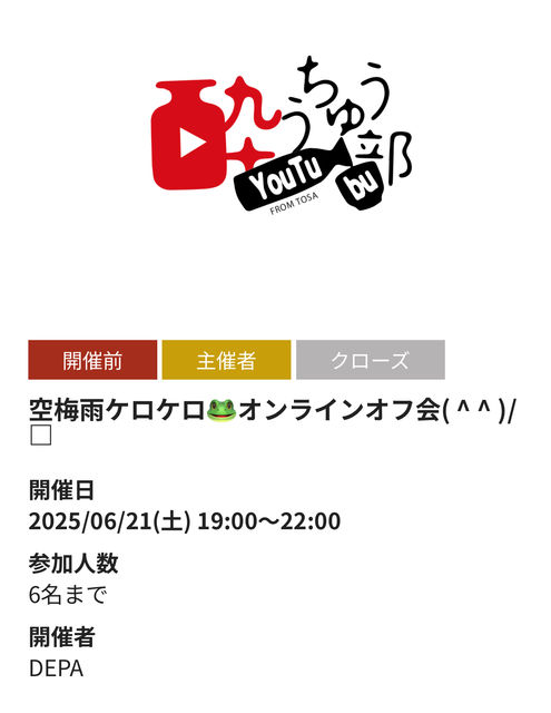 »²²ÃɽÌÀ¤Ï¤³¤Á¤é¤Î¥È¥Ô¥Ã¥¯¤Ë¤ª´ê¤¤¤·¤Þ¤¹¡£ https://mixi.jp/view_event.pl?comm_id=6361205&id=102225729 ¤Þ¤º¥³¥ß¥å¾ÜºÙ¤òÆÉ¤ß¡ÊÃí°Õ»ö¹à¤ËƱ°Õ¤Î»ÝµÆþ¡Ë»²²Ã¿½ÀÁ¤·¤Æ¤¯¤À¤µ¤¤¡£ ¡Ú½ÅÍסۥª¥Õ²ñ²ñ¾ìŹÊޤϰû¿©Êª¤Î»ý¤Á¹þ¤ß¤Ï¶Ø»ß¤Ç¤¹¡£ Ãë¿©¤Ï¥ª¥Õ²ñ³«»ÏÁ°¤Ë¥¬¥Ã¥Ä¥ê¡Ê¾Ð¡ËÀݤäƤª¤¤¤Æ¤¯¤À¤µ¤¤¡£ »²²Ã¼Ô£·Ì¾¡ÊÃËÀ£³¡¢½÷À£³¡¢ÉÔÌÀ£±¡Ë¡¡5/30¡¡04:30 ¸½ºß £±¡¡¥Æ¥±¥Æ¥±¤µ¤ó¡ÊÃËÀ¡Ë¼ñÌ£¿Í俱³ÚÉô¤è¤ê £²¡¡¤à¡Á¤ß¤ó¤µ¤ó¡Ê½÷À¡Ë¼ñÌ£¿Í俱³ÚÉô¤è¤ê £³¡¡Terry ¤µ¤ó¡Ê½÷À¡Ë¼ñÌ£¿Í俱³ÚÉô¤è¤ê £´¡¡ÇßÂÀϺ¤µ¤ó¡ÊÃËÀ¡Ë¼ñ