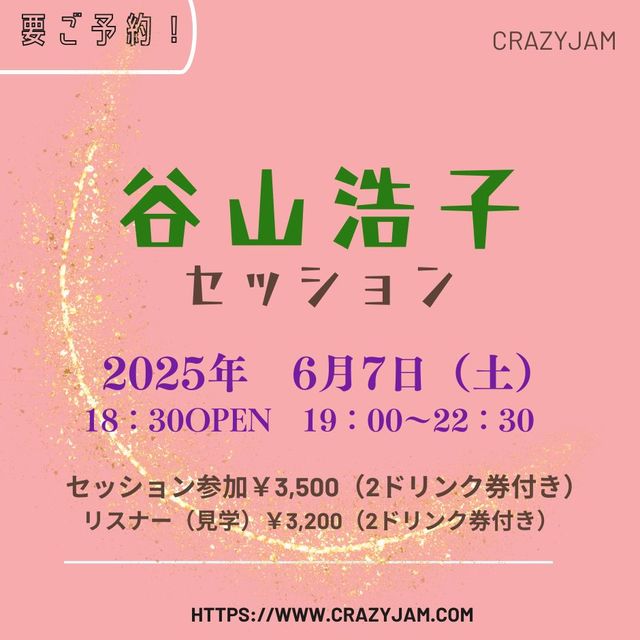 谷山浩子セッション<2025年 春> 開催決定! 皆様のご参加を心よりお待ちいたします。 ■ 2025/6/7(土)谷山浩子セッション ■ OPEN 18:30 START 19:00 会場/立川CRAZY JAM 東京都立川市高松町2丁目26−3 B1 https://www.crazyjam.com/ 参加費 / 3500円(2ドリンク込み) リスナー / 3200円(2ドリンク込み) ホストプレイヤー Ino Gt. Bs. エントリー・セットリスト表 https://docs.google.com/spreadsheets/d/1zOMCwGLuf8uARJVVw2m5P3mAZePiK6CsXc0DAWUYZrk/edit?usp=sharing チケットサイト