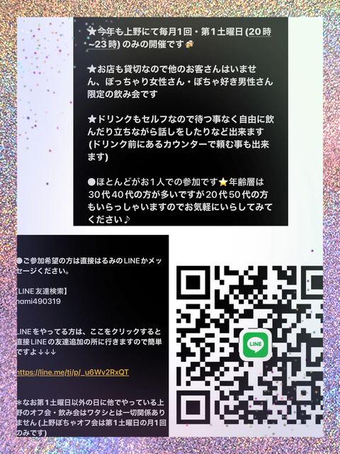 当日貸切です19:40〜すぐ飲めます♪(受付後セルフドリンクなので注文してから待つ感じではないので自由に移動したりしてドリンクバーを是非ご活用ください(カウンターで注文も出来ます) 上野ぽちゃオフ会は月1回(第1土曜日)のみですので最近は80人前後の大人数飲み会となっております♪ X(旧Twitter)やジモティー、他サイトやSNSに載せてますので毎回初参加の方が多いのでオフ会初めての方もすぐ和めるとかと思います、ご都合合う方は是非いらしてみて下さい! そして前回5/3(土)上野ぽちゃオフ会の後書きですが90名の方が来てくださいま