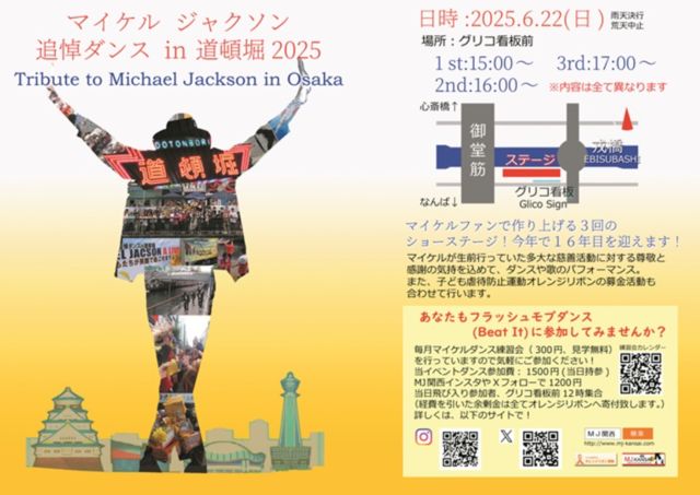 2009年6月25日(現地時間)に他界したking of popこと マイケル・ジャクソン氏を偲び、 フラッシュモブを通してマイケルの功績を伝えてゆき、全国の人々へと繋げてゆきたいという 思いで始まりました。社会現象ともなり各メディアにも多く取り上げられました。 今年も大阪の中心、道頓堀で フラッシュモブダンスを行います。 (事前に南警察の許可を得ています) 【テーマ】 2024全国Tribute Week "Start with Us〜僕達からはじめよう〜" 【日時】大阪 2025年6月22日(日)午後から3部構成(時間未定) 【概要】 "Start with Us"とは