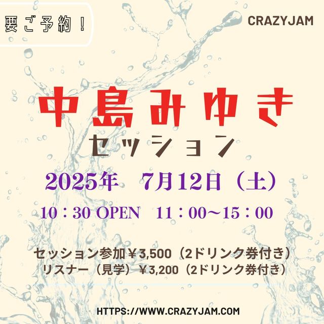 CRAZY JAM¤ÎÃæÅç¤ß¤æ¤¥»¥Ã¥·¥ç¥ó¤ò³«ºÅ¤·¤Þ¤¹¡ª ¤è¤í¤·¤¯¤ª´ê¤¤¤¤¤¿¤·¤Þ¤¹¡£ ¡úÂè48²ó¡¡ÃæÅç¤ß¤æ¤¥»¥Ã¥·¥ç¥ó¡ú Æü»þ¡¡2025ǯ¡¡7·î12Æü¡ÊÅÚ¡Ë¡¡ ¡¡¡¡¡¡10¡§30¥ª¡¼¥×¥ó¡¡11¡§00¡Á15¡§00 ¾ì½ê¡¡Î©ÀîCRAZY JAM ¡¡¡¡¡¡http://www.crazyjam.com/ ¥»¥Ã¥·¥ç¥ó»²²Ã¡¡¡ï3,500 ¥ê¥¹¥Ê¡¼»²²Ã¡¡¡¡¡ï3,200 ¿Ê¹Ô¡¡CJ¥¹¥¿¥Ã¥Õ ¥Á¥±¥Ã¥È¥µ¥¤¥È https://passmarket.yahoo.co.jp/event/show/detail/0155h6efp4h41.html ÅöÆü¸½¶â¤Ç¤Î¤ª»Ùʧ¤¤¤â²Äǽ¤Ç¤¹¡£ ¡ÚÊ罸Í×¹à¡Û ¡¡¥Ü¡¼¥«¥ë¡¡8̾ ¡¡¥®¥¿¡¼¡¢¥¡¼¥Ü¡¼¥É¡¢¥Ù¡¼¥¹¡¢¥É¥é¥à¡¡³Æ£¶Ì¾¤º¤Ä