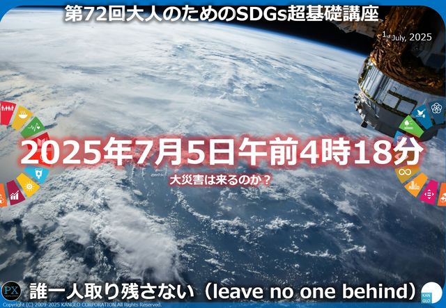 2025年7月5日午前4時18分〜大災害は来るのか?/第72回大人のためのSDGs超基礎講座(2025年7月1日) チケット https://kanglo-sdgs250701.peatix.com/view https://www.facebook.com/events/1432673718154347 --------------------------- 2015年9月25日、国連総会にてSDGsが採択され、あれからすでに10年が経とうとしています。人類は、21世紀に積み残してしまった地球全体の危機的課題の解決に向けてどれ程前進できたのでしょうか?SDGsは、人類史上初の世界規模における共通目標として始まりました。期限は2030年です。この時までに、人類