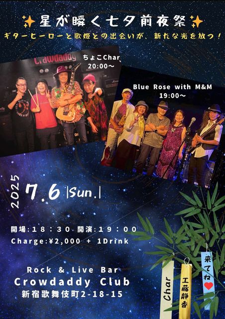 7/6 本日のライブ 星の瞬く七夕前夜祭ギターヒーローと歌姫の出会いが、新たな光を放つ! OPEN 18:30 START 19:00 CHARGE 2000円 act ○先発 BIue Rose with M&M (工藤静香コピーバンド) ○後発 ちょこChar (Charコピーバンド) よろしくお願いいたします!!