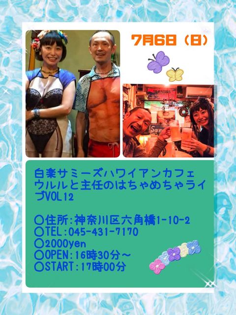 ●概要 7月6日(日) 白楽:サミーズカフェ ウルルと主任のはちゃめちゃライブ VOL.12 16:30/17:00 2000(+オーダー) ●内容 ウルルJUNと岡本主任のツーマンライブ。 それぞれツーステージ(順番は当日その場でジャンケン)。 タイトルどおり何が飛び出すか分からない、はちゃめちゃなライブです♪ ●タイムスケジュール ※順番はジャンケンで決定! 17:00 挨拶 17:10 1st 17:45 1st 18:15 休憩 18:25 2nd 19:00 2nd 19:30 アンコールセッション 19:40 終演 21時頃まで宴会?(笑)