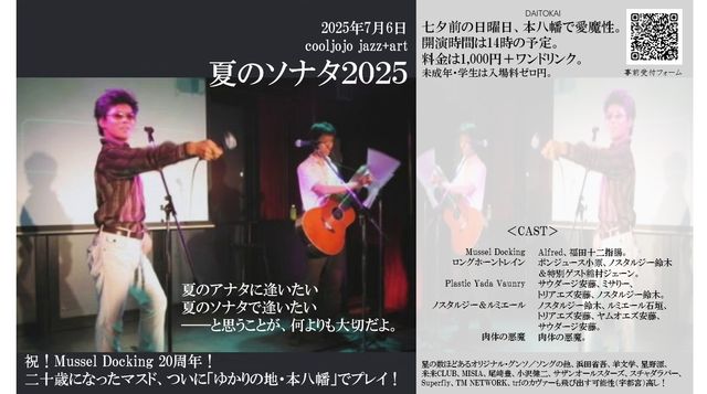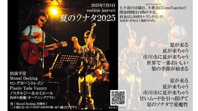夏のソナタと銘打った夏フェスをやります。マスドの仲間たちがたくさん出演してくれます! 日時:2025年7月6日(日)14:00-17:30頃の予定 会場:cooljojo jazz+art / 最寄駅:本八幡駅(千葉県市川市) 料金:1,000円+ワンドリンク(学生・未就学児はゼロ円) 出演:計5組、延べ15名 Mussel Docking ノスタルジー&ルミエール ロングホーントレイン(feat.稲村ジェーン) Plastic Yada Vaunry 肉体の悪魔 ← オープニングアクト?オープニングアクマ? 主催:Mussel Docking、ノスタルジー鈴木a.k.a.肉体の悪魔/福田十二指腸 https: