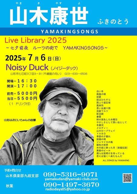 2025年7月6日(日) 「山木康世 Live Library 2025」 〜七夕前夜 ルーツの街で YAMAKINGSONGS〜 会場=Noisy Duck(ノイジーダック) 山形市七日町3丁目3−31 (千歳館の向い) 023−633−6506 開場=16:30 開演=17:00 前売=5000円 当日=5500円 (1ドリンク付) 予約・問合せ 090-5316-9071 (山木倶楽部九段支部) yamakudan@yamaki-club.com 090−1497−3670 (秋葉) radiodays05@yahoo.co.jp