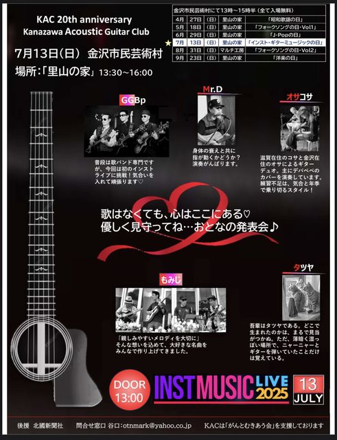 2025/07/13ÆüÍË¡¡13:30-16:00 ¶âÂô»Ô̱·Ý½Ñ¼¡¡Î¤»³¤Î²È¤Ë¤Æ¡¢ ¶âÂô¥¢¥³¡¼¥¹¥Æ¥£¥Ã¥¯¥®¥¿¡¼¶æ³ÚÉô¤Î20¼þǯµÇ°¥é¥¤¥Ö¡Ö¥¤¥ó¥¹¥È¡¦¥®¥¿¡¼¥ß¥å¡¼¥¸¥Ã¥¯¤ÎÆü¡×¤¬³«ºÅ¤µ¤ì¤Þ¤¹¡£ÌµÎÁ¡£