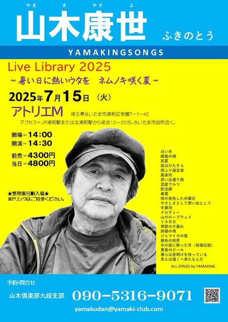 「山木康世 Live Library 2025」 〜暑い日に熱いウタを ネムノキ咲く夏〜 会場=アトリエM https://maru-atelier-m.com/ 埼玉県さいたま市浦和区常盤7−1−42 アクセス=JR浦和駅または北浦和駅から徒歩12〜20分。さいたま市役所近く。 開場=14:00 開演=14:20 前売=4300円 当日=4800円 ★整理番号順入場★ ※ドリンクはご持参ください。 問合せ 090−5316−9071 (山木倶楽部九段支部) yamakudan@yamaki-club.com