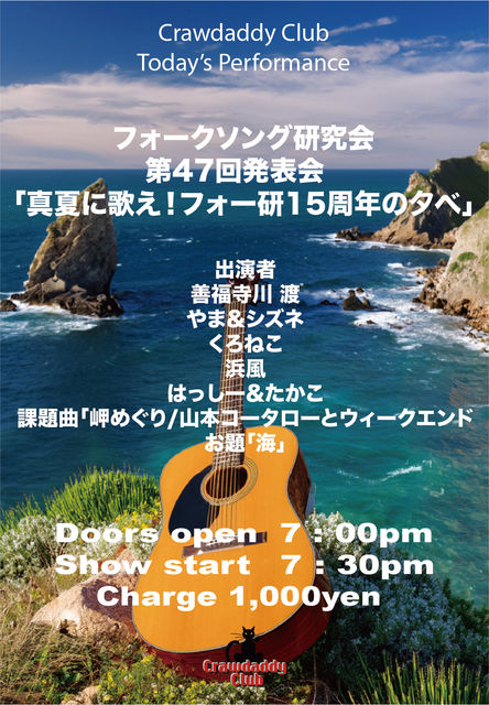 7/16 本日は フォークソング研究会 第47回発表会 「真夏に歌え!フォー研15周年の夕べ」 OPEN 19:00 START 19:30 CHARGE 1000円 出演者 善福寺川 渡 やま&シズネ くろねこ 浜風 はっしー&たかこ 課題曲は「岬めぐり/山本コータローとウィークエンド お題は「海」 よろしくお願いいたします!!