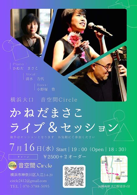 ♪live &session♪ 日時:7月16日(水)open 18:30 / start 19:00- 場所:大口circle https://otokukan-circle.my.canva.site/ MC:2,500円☆2品以上のご注文をお願いします☆ メンバー:pf/かねだまさこ ba/小野塚豊 vo/清水方代 明日7/16(水)は大口circleでlive &session 19時から始まります 今回もピアノかねだまさこさんとベース小野塚豊さんの3人で 演奏をお聴きいただいた後、たっぷりセッションをお楽しみいただければと。。。ぜひ楽器、楽譜を持っておたずねくださいね まさこちゃんの素敵なピアノ、