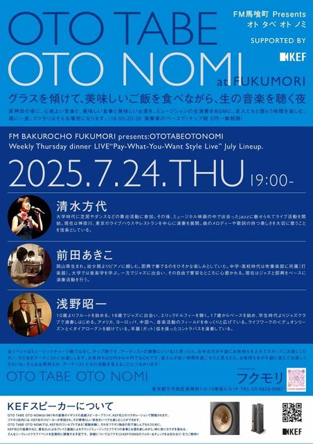 日時:7月24日(木)1st 19:00- / 2nd 20:00- 場所:馬喰町フクモリ https://tabelog.com/tokyo/A1302/A130204/13090984/ https://www.instagram.com/fukumori_bakurocho/ MC:投げ銭 メンバー:ba/浅野昭一 pf/前田あきこ vo/清水方代 明日7/24(木)は馬喰町フクモリでライブ 19時から2セット演奏します ベース浅野昭一さんにお声がけいただいての初出演、ピアノ前田あきこさんとも初めましてでとても楽しみです フクモリさんは山形の食材を使ったお料理と、地酒やBIOワインが評判のお店、お食事がてらふらりん応援に