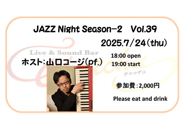 ホストプレーヤーにピアニストの山口コージ氏をお迎えしてのジャズセッションです。 毎月第4木曜日に開催!! ☆2025年7月24日(木) 18:00〜 OPEN ・19:00頃よりご参加状況を見てスタートします。 ・音出しは22:00までとなっております。 ◆参加費 ¥2,000 ※別途ご飲食をお願いいたします。 ◆ホストプレーヤー ピアノ 山口コージ セッションに参加ご希望の方は、リクエスト曲のコードとサイズ・進行等が分かる譜面をお持ちいただくとスムースに進められると思います。 もちろんリスナーとしてのご参加大歓迎