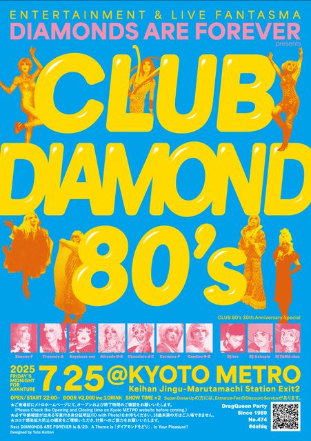 2025 07 25 fri @ KYOTO METRO DIAMONDS ARE FOREVER presents CLUB DIAMOND 80's Open / Start: 10:00¡Á¡¡Door: \2.000 (w/1drink) Showtime: 11:50 and Midnight DJ: kor / Achapin / Yamachan / 5364 CAST: ¥·¥â¡¼¥Ì¿¼Àã/¥Õ¥é¥ó¥½¥ï·¥¢¥ë¥Ç¥ó¥Æ / ¤½¤èÉ÷¤µ¤ó / ¥¢¥Õ¥ê¡¼¥À·¥ª¡¼·¥Ö¥é¡¼¥È / ¥·¥ç¥³¥é·¥É·¥·¥ç¥³¥é / ¥«¥ë¥ß¥Ê·¥×¥ê¥Þ¥ô¥§¡¼¥é / ¥¥ã¥ó¥Ç¥£¥¹·¥Ð¡¼·K and more¡Ä¡¡ Club 80's 30th Anniversary Special