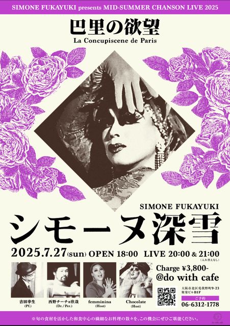 2025 07 27 sun @ Âçºå ÅÆ²æÌîÄ® do with cafe ¥·¥â¡¼¥Ì¿¼À㠥ߥåɥµ¥Þ¡¼ ¥·¥ã¥ó¥½¥ó¥é¥¤¥ô 2025 ¡ÝÇÃΤ¤ÎÍß˾ La Concupiscene de Paris ¡Ý Open 18:00¡Á¡¡Live Start 20:00¡Á (1Éô£²Éô Æþ¤ìÂØ¤¨¤Ê¤·) Charge \3.800 (¤ª¿©»ö ¤ª°û¤ßʪ¤Ï ÊÌÅÓÎÁ¶â¤È¤Ê¤ê¤Þ¤¹) ¥·¥â¡¼¥Ì¿¼Àã (vo.) µÈÅŬÀ¸ (pf.) À¾Ìî¥Á¡¼¥Á¥ç¶ÕºÈ (dr. Per.) femminina (Host) Chocolate de Chocolate (Host) do with cafe Âçºå»ÔË̶èÅÆ²æÌîÄ®9-23 æÜ³Ú¥Ó¥ëB1F ¤´Í½Ìó / Ì䤤¹ç¤ï¤» 0663121778
