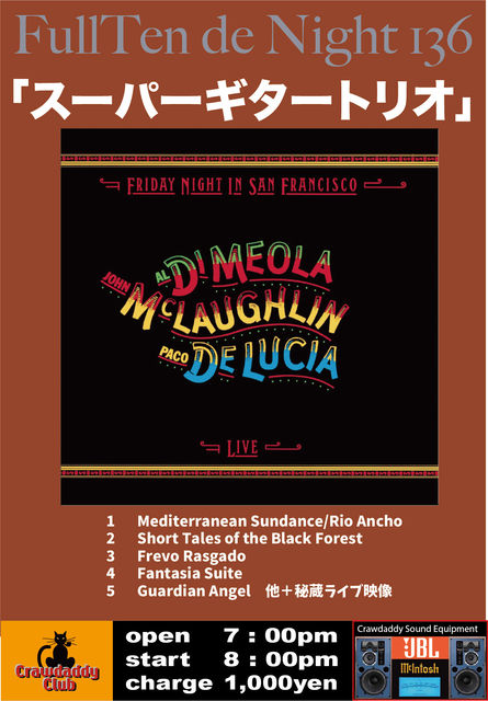 7/30 本日はFullTen de Night 136夜 「スーパーギタートリオ」Friday Night In San Francisco いつもより短めのフルテンとなりますが、 超絶ギターに酔いしれましょう〜 OPEN 19:00 START 20:00 CHARGE 1000円