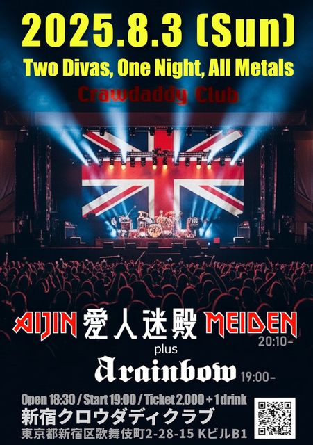8/3 ËÜÆü¤Î¥é¥¤¥Ö¡¡ °¦¿ÍÌÂÅÂ(as Iron Maiden) ¡õ Arainbow Live¡¡ OPEN 18:30 START 19:00 CHARGE 2000±ß¡¡ ¤è¤í¤·¤¯¤ª´ê¤¤¤¤¤¿¤·¤Þ¤¹¡ª¡ª