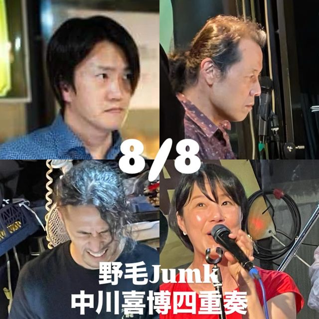 日時:8月8日(金)open 19:00 / 1st 20:00- / 2nd 21:20- 場所:野毛Junk http://www7b.biglobe.ne.jp/~nogejunk/ 入場料:2,000円☆各セット2,400円以上のご注文をお願いします☆ メンバー:dr/中川喜博 pf/進藤陽悟 ba/村谷有祐 vo/清水方代 8/8(金)は野毛Junkで「中川喜博四重奏」ライブ 20時からと21時20分からのたっぷり1時間ずつ演奏します (内容は異なりますので、ぜひ両セットお楽しみください) 毎月第2金曜日のよっしーこと中川喜博さんリーダーライブに参加させていただくのは。。。もう何回目!?