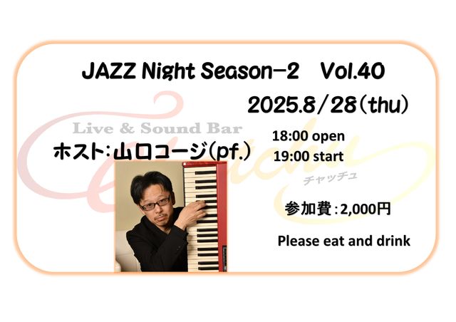ホストプレーヤーにピアニストの山口コージ氏をお迎えしてのジャズセッションです。 毎月第4木曜日に開催!! ☆2025年8月28日(木) 18:00〜 OPEN ・19:00頃よりご参加状況を見てスタートします。 ・音出しは22:00までとなっております。 ◆参加費 ¥2,000 ※別途ご飲食をお願いいたします。 ◆ホストプレーヤー ピアノ 山口コージ セッションに参加ご希望の方は、リクエスト曲のコードとサイズ・進行等が分かる譜面をお持ちいただくとスムースに進められると思います。 もちろんリスナーとしてのご参加大歓迎
