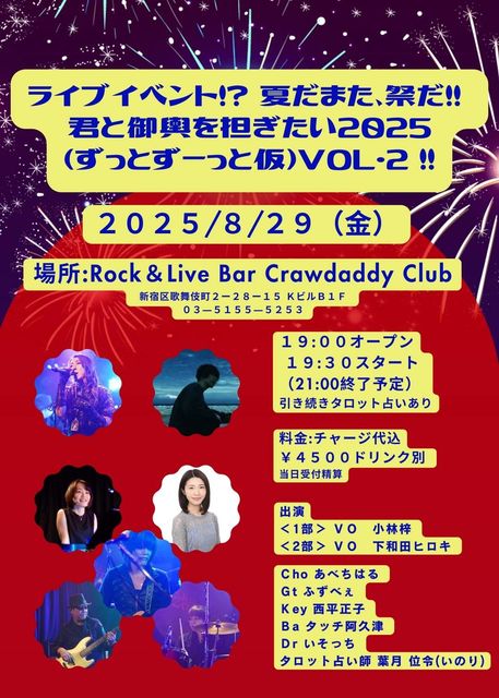 8/29 ËÜÆü¤Î¥é¥¤¥Ö¡¡ ²Æ¤À¤Þ¤¿¡ª¡ª¡¡º×¤À¡ª¡ª ·¯¤È¸æÍÁ¤òô¤®¤¿¤¤£²£°£²£µ¡Ê¤º¤Ã¤È²¾¡ËV£ÏL¡¦£² ¡ª¡ª OPEN 19:00 START 19:30 CHARGE 4500±ß act¡¡ ¤¢¤º¡¼¤ë¡¡ ²¼ÏÂÅÄ¡¡ ¤è¤í¤·¤¯¤ª´ê¤¤¤¤¤¿¤·¤Þ¤¹¡ª¡ª