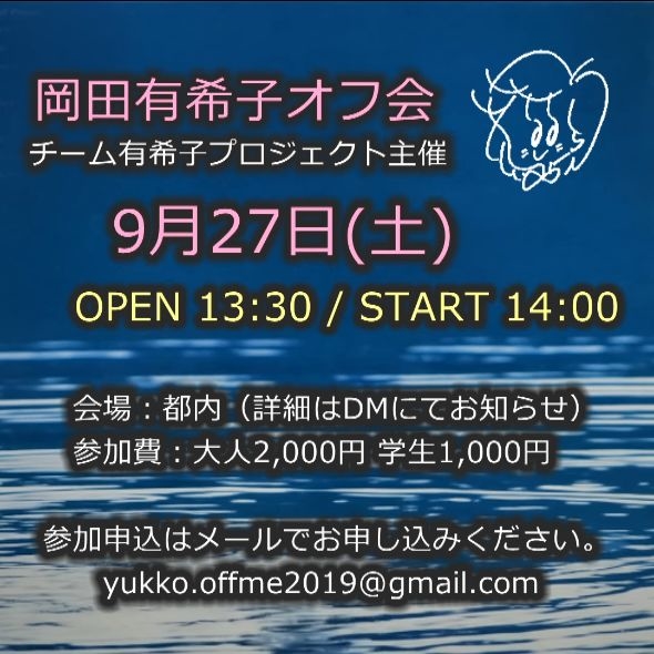 ²¬ÅÄÍ´õ»Ò¥ª¥Õ²ñ2025ǯ9·î27Æü(ÅÚ)³«ºÅ ¤´Ìµº»ÂÁ¤·¤Æ¤ª¤ê¤Þ¤¹¡£ ¥æ¥Ã¥³¥Õ¥ì¥ó¥º¤Î¤¿¤á¤Î¥ª¥Õ²ñ¤Î¤ªÍ¶¤¤¤Ç¤¹¡£ Åö½éÃÂÀ¸ÆüÁ°¸å¤Î8·î¤Ç·×²è¤·¤Æ¤ª¤ê¤Þ¤·¤¿¤¬½ô»ö¾ð¤Ë¤è¤êÍè·î³«ºÅ¤µ¤ì¤ë¤³¤È¤Ë¤Ê¤ê¤Þ¤·¤¿¡£À¸Ã½ˤˤ·¤Æ¤Ï»þ´ü¤â¡Ö½½·î¤Î¿Íµû¡×¤È¤¤¤¦¤³¤È¤Ç¤½¤ì¤Ë°ø¤ó¤ÀÆâÍÆ¤òͽÄꤷ¤Æ¤ª¤ê¤Þ¤¹¡£ ²¬ÅÄÍ´õ»Ò¥ª¥Õ²ñ ³«ºÅÆü¡§2025ǯ9·î27Æü(ÅÚ) OPEN 13:30 / START 14:00 ¼çºÅ¡§¥Á¡¼¥àÍ´õ»Ò¥×¥í¥¸¥§¥¯¥È ³«ºÅÃÏ¡§Åìµþ23¶èÆâ 20̾Í͸ÂÄê¤È¤Ê¤ê¤Þ¤¹¡£ ¿½¹þ¡¦¤ªÌ䤤¹ç¤ï¤»¤Ï¡¢¤³¤Á¤é¤Þ¤Ç¡ª ¢ ¡Ôyukko.offme2019@gmail.com¡Õ ²¬ÅÄ