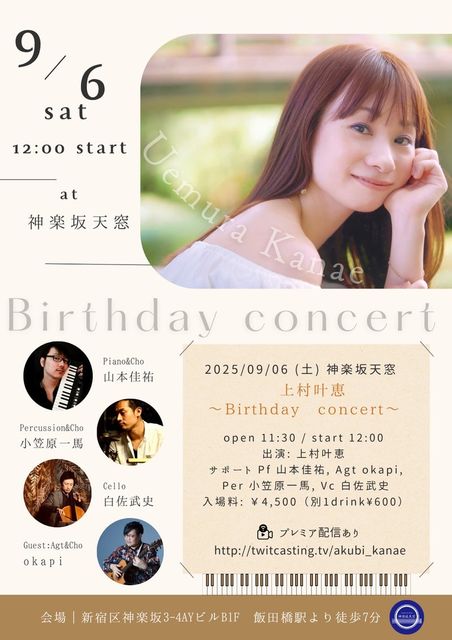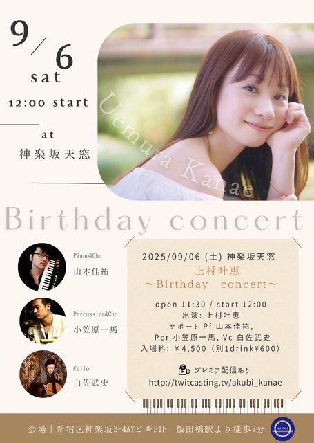 2025/09/06 (ÅÚ) ¿À³ÚºäÅ·Áë ¾å¼³ð·Ã¡ÁBirthday concert¡Á open 11:30 / start 12:00 ½Ð±é: ¾å¼³ð·Ã / ¥µ¥Ý¡¼¥È: Pf »³ËܲÂÍ´, Per ¾®³Þ¸¶°ìÇÏ, Vc Çòº´Éð»Ë ¥²¥¹¥È Agt okapi Æþ¾ìÎÁ: ¡ï4,500¡ÊÊÌ1drink\600¡Ë ¢¨Æþ¾ì»þ¤Ï¥Á¥±¥Ã¥ÈÈÖ¹æ½çÆþ¾ì¤È¤Ê¤ê¤Þ¤¹ *¤´Í½Ìó¤Ï ¢ ¡¡https://uemura-kanae.com/artist/live-list *¥Á¥±¥Ã¥ÈȯÇ䳫»Ï¤Ï 3/22¡ÊÅÚ¡Ë¥¹¥Æ¡¼¥¸¸å¤è¤ê ¡ö¥ï¥ó¥Þ¥ó¤ÎÇÛ¿®¥Ú¡¼¥¸¤¬¤Ç¤¤Þ¤·¤¿¢ ¡¡https://premier.twitcasting.tv/akubi_kanae/shopcart/390701 ¡ö¿À³ÚºäÅ·Áë¡Ö¤«¤°