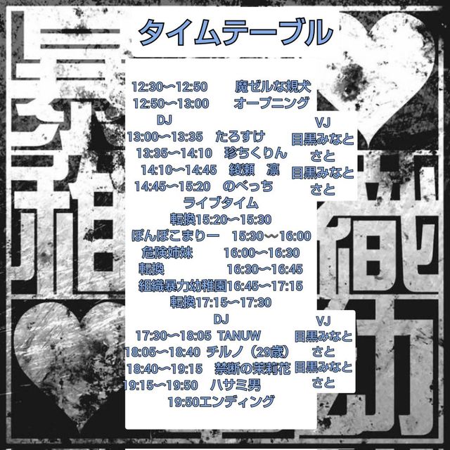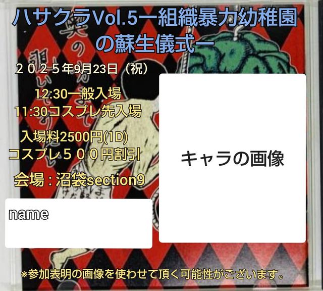 ¥Ï¥µ¥ßÃË´ë²è ¡Ö¥Ï¥µ¥ßÃˤΤä¤ë¥¢¥Ë¥¯¥é(¥Ï¥µ¥¯¥é)Vol.5-ÁÈ¿¥Ë½ÎÏÍÄÃÕ±à¤ÎÁÉÀ¸µ·¼°-¡× ³«¾ì 11:30(¥³¥¹¥×¥ìÀèÆþ¾ì)¡¦12:20(°ìÈÌÆþ¾ì)/³«±é 12:30 ÎÁ¶â 2500±ß(¡Ü1drink) ¢¨ ¥Ä¥¤¥×¥é»²²Ã¾ÚÌÀ¤Þ¤¿¤Ï¥³¥¹¥×¥ì»²²Ã¤Ç500±ß°ú¤ https://twipla.jp/events/684126 [±àĹ(ÁÈ¿¥Ë½ÎÏÍÄÃÕ±à)½Ð·â»þ´Ö] 16:45¡Á17:15 [¢¢ ͽÌó ¢¢] https://www.yo-chien.love/yoyaku0923/ [¥²¥¹¥È] ±àĹ¡ÊÁÈ¿¥Ë½ÎÏÍÄÃÕ±à¡Ë/Ë⥼¥ë¤Êµ¬¸¤ [DJ] ¤Î¤Ù¤Ã¤Á/ÄÁ¤Á¤¯¤ê¤ó/TANOW/¤¿¤í¤¹¤±/¥Á¥ë¥Î(29ºÐ)/¶ØÃǤÎçýè½²Ö/°½À¥ÑÛ [VJ] Ìܹõ¤ß¤Ê¤È/¤µ¤È [¥¹¥¿