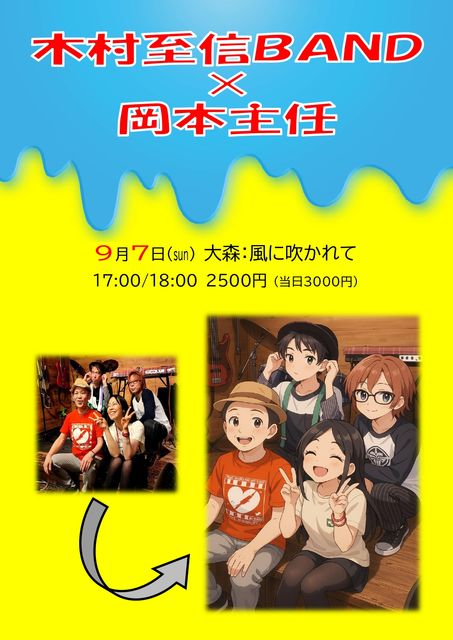 ●概要 9月7日(日) 第21回 岡本主任vs木村至信BAND 17:00/18:00 予約2500 当日3000 (+オーダー) ●タイムスケジュール 18:00 挨拶 18:05 木村至信BAND 18:40 岡本主任 19:10 休憩 19:20 岡本主任 19:55 木村至信BAND 20:25 お楽しみショー? ●内容 正真正銘プロのバンド「木村至信BAND」との、定例ツーマン。 あの「お楽しみショー」はどうなるのか?
