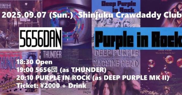 9/7 本日のライブ PURPLE IN ROCK(as Deep Purple) & 5656団(as Thunder) LIVE OPEN 18:30 START 19:00 CHARGE 2000円 よろしくお願いいたします!!
