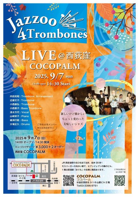 ♪Jazzoo 4 Trombones Live♪ 日時:9月7日(日)open 14:00 / start 14:30- 場所:西荻窪COCO PALM https://www.livecocopalm.net/ MC:3,000円☆2品以上のご注文をお願いします☆ メンバー:btb/小西葉子 tb/内田光昭、近藤文子、小西康弘 pf/速水真理 ba/細洞行範 dr/大場正久 vo/清水方代 週末9/7(日)はJazzoo 4 Trombones Live 14時半から西荻窪COCO PALMで演奏します バストロンボーン小西葉子さん率いるJazzoo 4 Trombonesでの音作り メンバーピアニストの山崎栄子さんが残念ながら手の負傷でお休みとなり