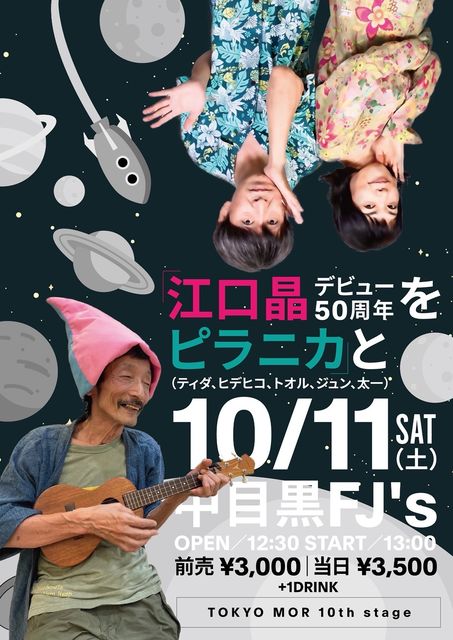 10月11日(土) 東京都 中目黒 Cafe & Live spot FJ's https://fjslive.com 「TOKYO MOR 10th stage 〜江口 晶デビュー50周年をピラニカと〜 」 出演:ピラニカ(ティダ、ヒデヒコ、トオル、ジュン、太一) / 江口 晶 open12:30 start13:00 前売り3000円 当日3500円 共に+1DRINK ピラニカ、2025年秋の東京ライブは、先日地元名古屋での記念ライブを盛況のうちに終えた江口 晶さんをスペシャルゲストにお迎えして、東京でも一緒にデビュー50周年をお祝いしたいと思います。ピラニカ、江口 晶それぞれのステージに、共演も有り。ご期待下さ