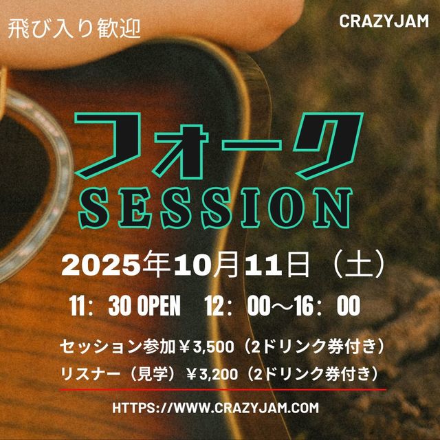 第1回 フォークセッション@CRAZYJAM 新旧問わず、フォークっぽいもの 吉田拓郎、中島みゆき、井上陽水、アリスから、スピッツ、あいみょんまで!!! 和・洋も問いません。 歌本片手に、ギター片手に、 ギター以外の楽器の方も、ご参加をお待ちしております。 みなさんと一緒に楽しい時間を過ごせたら嬉しいです。 よろしくお願いいたします。(^^)/ ★第1回 フォークセッション@CRAZYJAM 日時 2025年 10月11日(土) 11:30オープン 12:00〜16:00終了 場所 立川CRAZY JAM http://www.crazyjam.com/ 料金 ¥