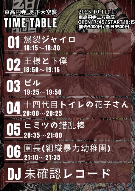 ●2025年10月11日(土) 園長&ヒミツの錯乱棒企画「東高円寺地下大空襲」 場所:東高円寺二万電圧 OPEN 17:45 | START 18:15 料金:前売3,000円 当日3,500円+1ドリンク 出演 ・園長(組織暴力幼稚園) ・十四代目トイレの花子さん ・ヒミツの錯乱棒 ・爆裂ジャイロ ・ビル ・王様と下僕 ※王様と下僕は18:50頃登場予定。