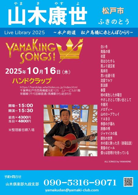 「山木康世 LIVE Library 2025」 〜水戸街道 松戸馬橋に赤とんぼひらり〜 会場=ハンドクラップ https://handclap.whathides.co.jp/index.html 千葉県松戸市西馬橋蔵元町125 ムトービルB1階 常磐線(千代田線直通)馬橋駅から徒歩5分 開場=15:00 開演=15:30 前売=4300円 当日=4800円 ★整理番号順入場★ 予約・問合せ 山木倶楽部九段支部 090-5316-9071 yamakudan@yamaki-club.com