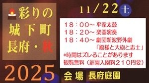 #彩りの城下町長府 #イベント が決まりました 11月22日(土)#長府庭園にて 18:00〜 #平家太鼓 勝山会 18:20〜 #楽器演奏 18:40〜 劇団新波 #野外劇「#殿様と大砲と志士」 *時間は多少ズレるすることがあります #観覧無料(長府庭園入園料210円は別途要) 雨天中止 当日、長府は #キャンドルナイト も開催です キャンドルの町明かりと共にお楽しみください