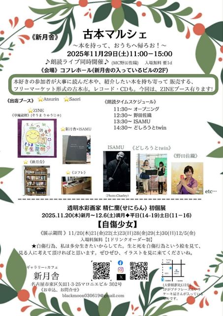 大曽根駅前に在る「ギャラリー+カフェ 新月舎」主催のイベント。 本好きの参加者が読んだ本や、紹介したい本を持ち寄って販売するフリーマーケット形式の古本市。レコード・CDも。今回はZINEブースも有ります! ▢11/29(土) 題目: 古本マルシェ 〜本を持って、おうちへ帰ろお! 〜 場所: 大曽根「コフレホール」 愛知県名古屋市東区矢田1-3-25 マロニエビル202号室 料金: 入場無料(要1ドリンクオーダー) 出演: 野田佐織 ISAMU どしろうとtwin 出店: ZINE:草魔龍樹(そうまりゅうじゅ) Saori Atsurin 新月舎 新月舎×ISAMU ※朗読ライブ開催! 《