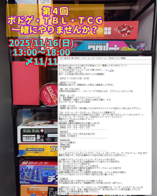 まだ始めたばかりで少人数ですが参加メンバー募集しております('◇')ゞ よろしくお願いしますm(__)m 11月はまだまだ【コリドール】を擦ります(; ・`д・´)v 2人〜4人用ゲームです。 他ゲームも希望が有れば行います!!(20種類程) 【日付】11/16(日)13:00〜18:00 【締切】11/11(水) 開催最低人数4人…開催決定した際はご連絡差し上げます。 【場 所】〒542-0072 大阪市中央区高津3-1-1 シティアーク下寺町ビル4F ラグランジュポイント内 【料金・コース】 A:飲み放題付…¥220(ソフトドリンク) B:冷製緑茶:冷製