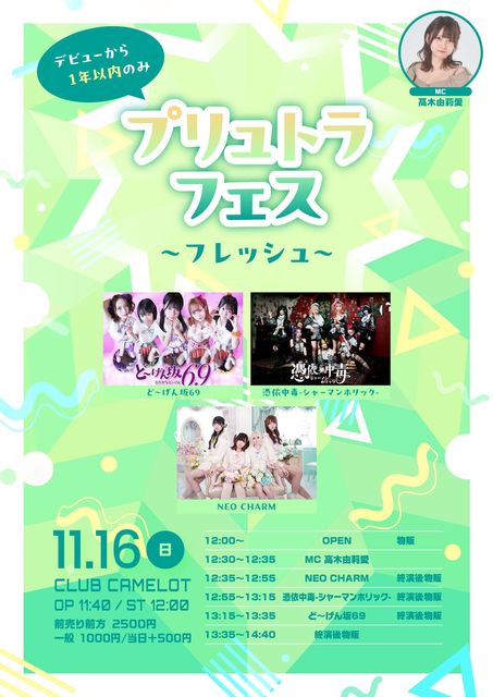 ¡ÚMC¡Û¡Ö¥×¥ê¥å¥È¥é¥Õ¥§¥¹¡Á¥Õ¥ì¥Ã¥·¥å¡Á¡× Æü»þ¡§11/16(Æü) ³«¾ì11:40 / ³«±é12:00 ²ñ¾ì¡§ CLUB CAMELOT ÎÁ¶â¡§ Á°Çä Á°Êý2,500±ß/°ìÈÌ 1,000±ß/ÅöÆü ¡Ü500±ß (DÊÌ) ¥Á¥±¥Ã¥È¡§https://ticketdive.com/event/1pltr1116 ½Ð±é¡§ ¤É¡Á¤²¤óºä69(¤Ò¤é¤¬¤Ê¤É¡Á¤²¤ó)/Øá°ÍÃæÆÇ-¥·¥ã¡¼¥Þ¥ó¥Û¥ê¥Ã¥¯-/NEO CHARM MC¡§üâÌÚͳ轰¦
