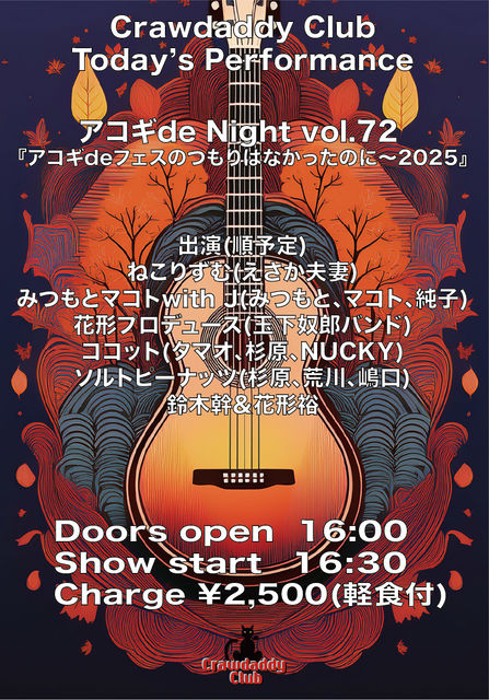 11/30 ËÜÆü¤Î¥é¥¤¥Ö¡¡ ¥¢¥³¥®de Night vol.72 ¡Ø¥¢¥³¥®de¥Õ¥§¥¹¤Î¤Ä¤â¤ê¤Ï¤Ê¤«¤Ã¤¿¤Î¤Ë¡Á2025¡Ù OPEN 16:00 START 16:30 CHARGE 2500±ß ½Ð±é(½çͽÄê) ¤Í¤³¤ê¤º¤à ¤ß¤Ä¤â¤È¥Þ¥³¥Èwith J ²Ö·Á¥×¥í¥Ç¥å¡¼¥¹(¶Ì²¼ÅÛϺ¥Ð¥ó¥É) ¥³¥³¥Ã¥È ¥½¥ë¥È¥Ô¡¼¥Ê¥Ã¥Ä ÎëÌÚ´´&²Ö·Á͵¡¡ ¤è¤í¤·¤¯¤ª´ê¤¤¤¤¤¿¤·¤Þ¤¹¡ª¡ª