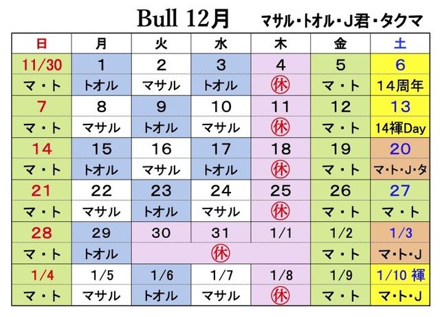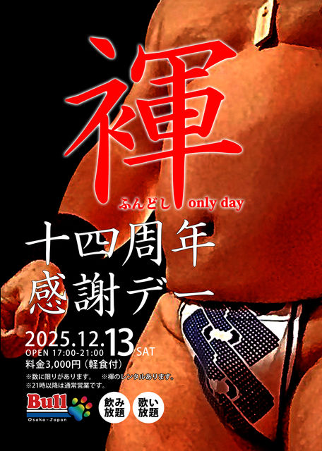 12月予定 日増しに寒くなって師匠走る年を締め括る12月ですね。 ☆ Bull14周年感謝祭 12月6日土曜日19時から26時かな! 飲み放題・歌い放題・軽食付き3000円 キープボトル半額(一人1本、高額ウィスキー除く) ☆14周年褌Day 12月13日(土)17時から21時まで褌オンリー。 飲み放題・歌い放題・軽食付き3000円 キープボトル半額(一人1本、高額ウィスキー除く) ※ 21時からは通常営業です。 ☆ Bull たこ焼きパーティー&忘年会 12月20日(土)15時〜18時 募集定員24名